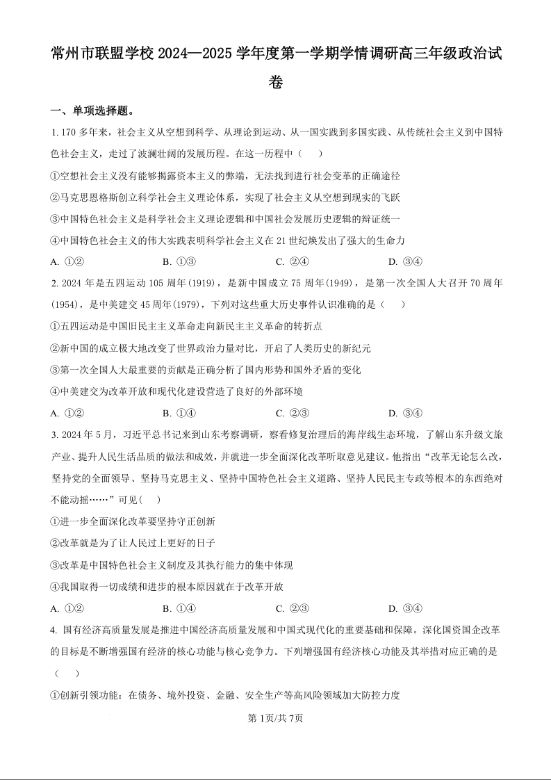 江苏省常州市联盟学校2025届高三上学期10月月考 政治
