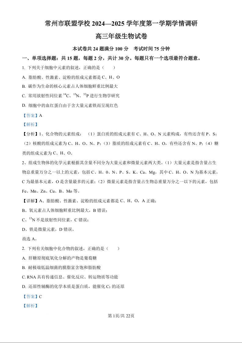 江苏省常州市联盟学校2025届高三上学期10月月考 生物答案