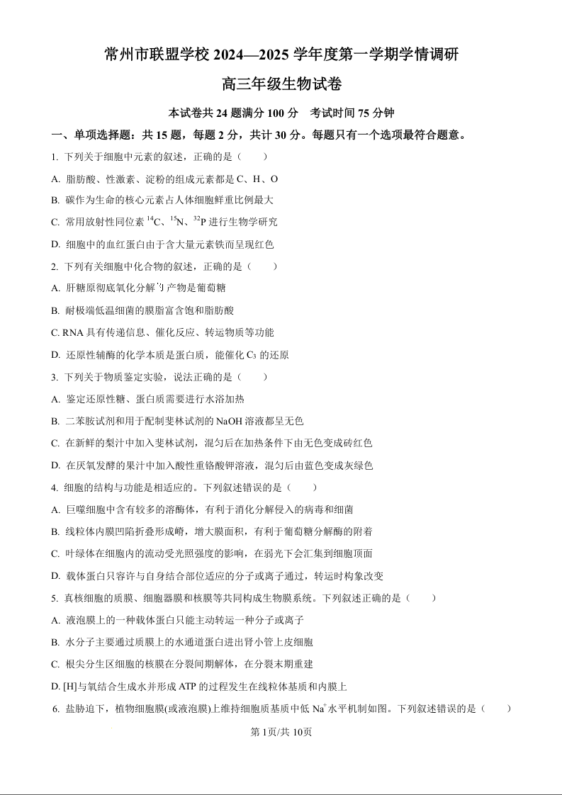江苏省常州市联盟学校2025届高三上学期10月月考 生物