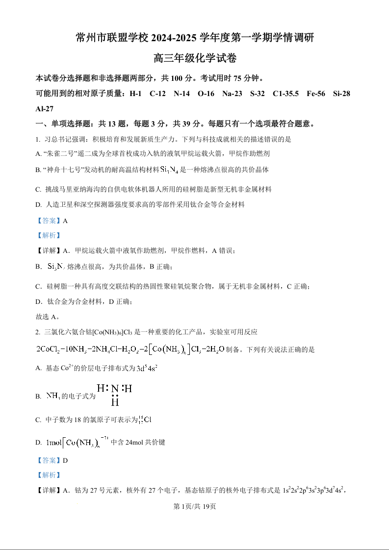 江苏省常州市联盟学校2025届高三上学期10月月考 化学答案