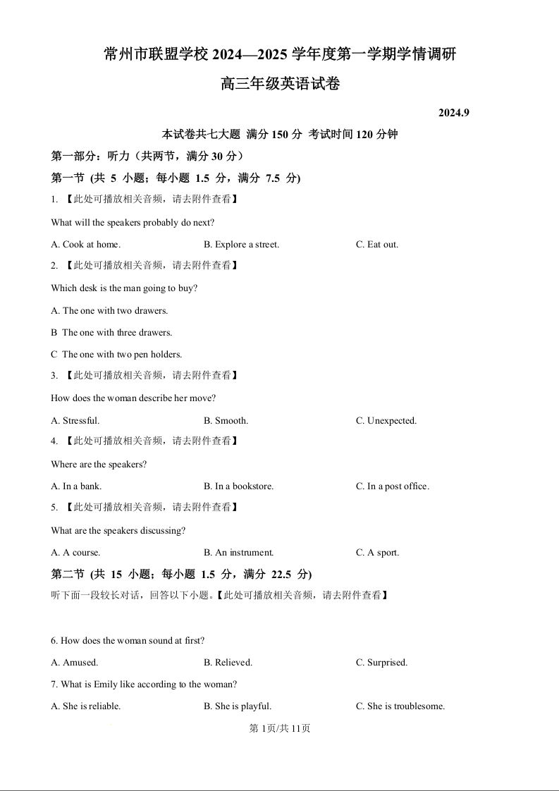 江苏省常州市联盟学校2025届高三上学期10月月考 英语