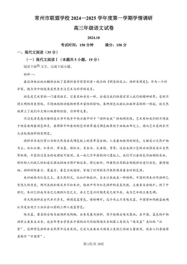 江苏省常州市联盟学校2025届高三上学期10月月考 语文