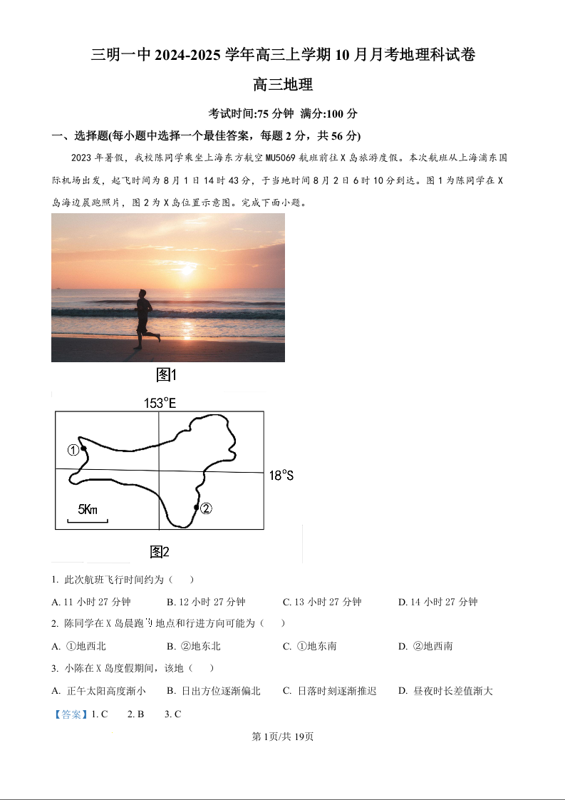 福建省三明第一中学2025届高三上学期10月月考 地理答案