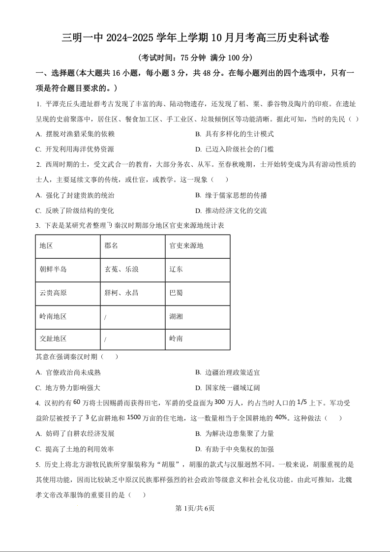福建省三明第一中学2025届高三上学期10月月考 历史