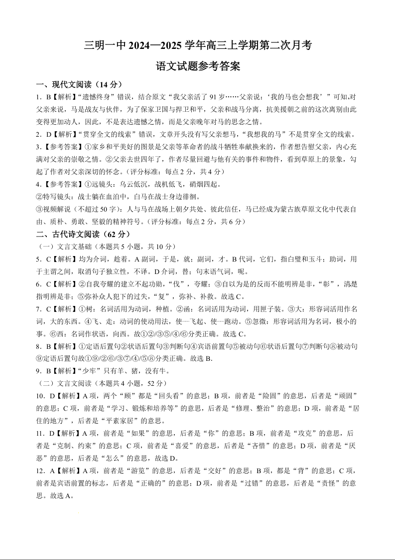 福建省三明第一中学2025届高三上学期10月月考 语文答案