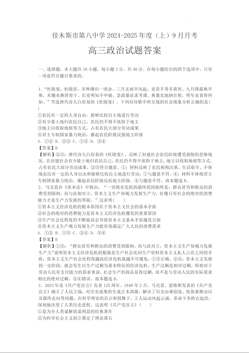 黑龙江省佳木斯市第八中学2025届高三上学期10月月考 政治答案