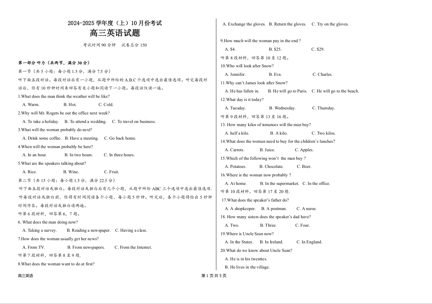 黑龙江省佳木斯市第八中学2025届高三上学期10月月考 英语
