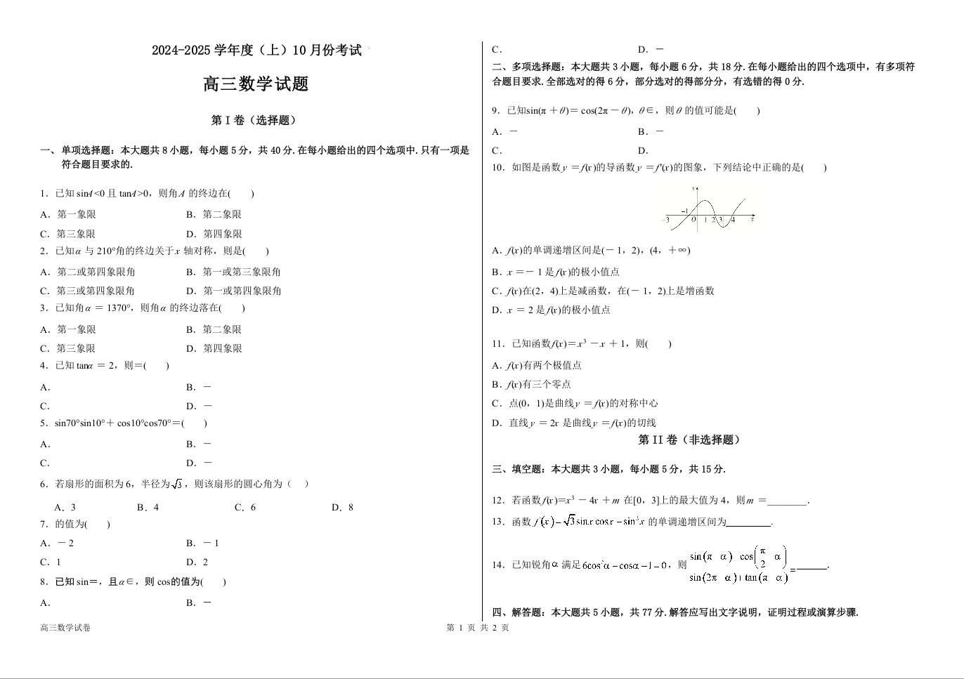 黑龙江省佳木斯市第八中学2025届高三上学期10月月考 数学