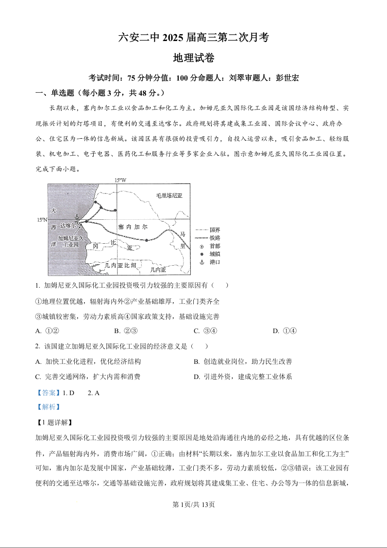 安徽省六安第二中学2025届高三上学期10月月考 地理答案