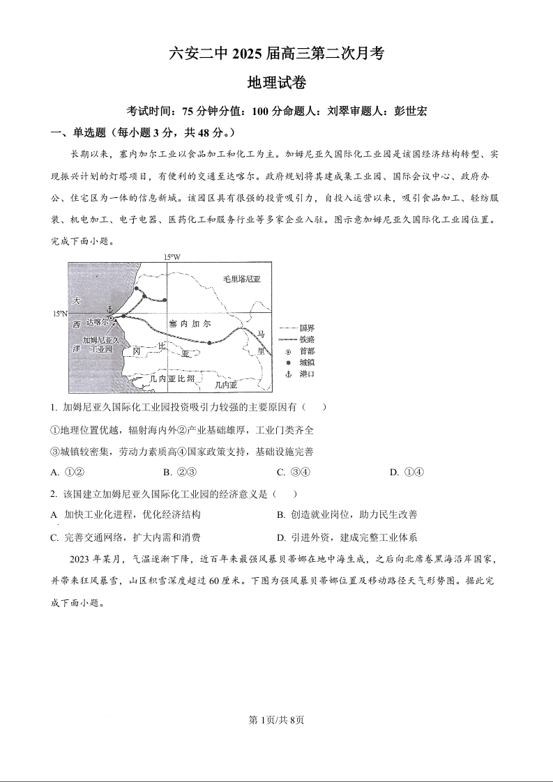 安徽省六安第二中学2025届高三上学期10月月考 地理