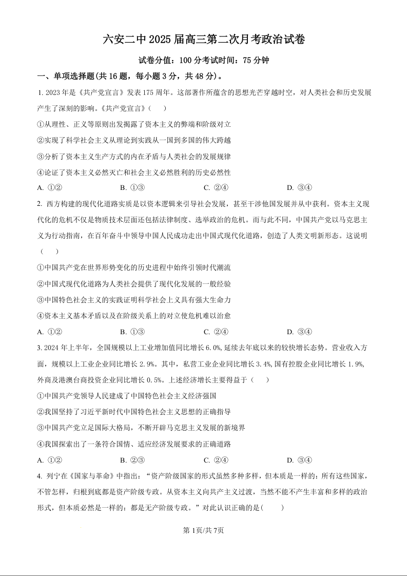 安徽省六安第二中学2025届高三上学期10月月考 政治