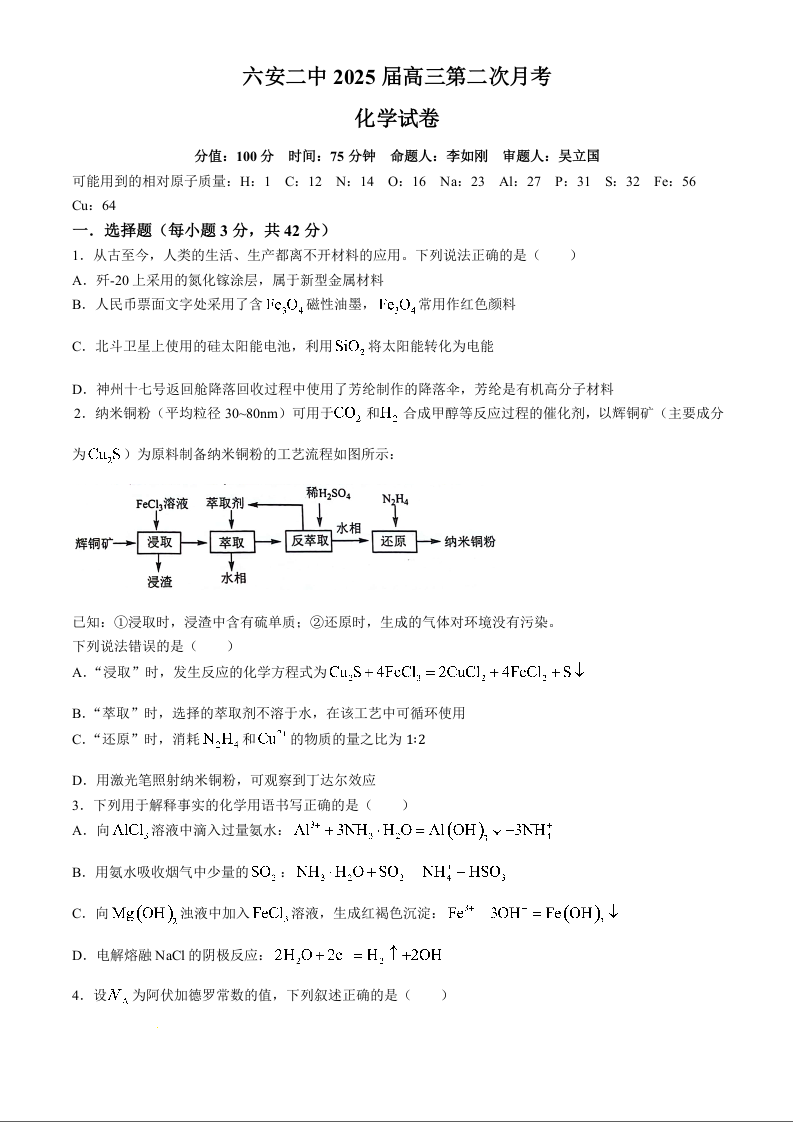 安徽省六安第二中学2025届高三上学期10月月考 化学