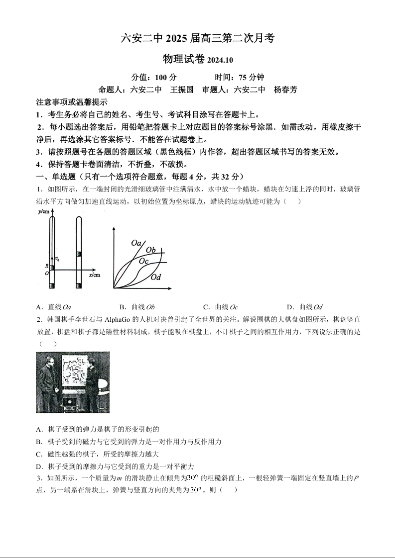 安徽省六安第二中学2025届高三上学期10月月考 物理