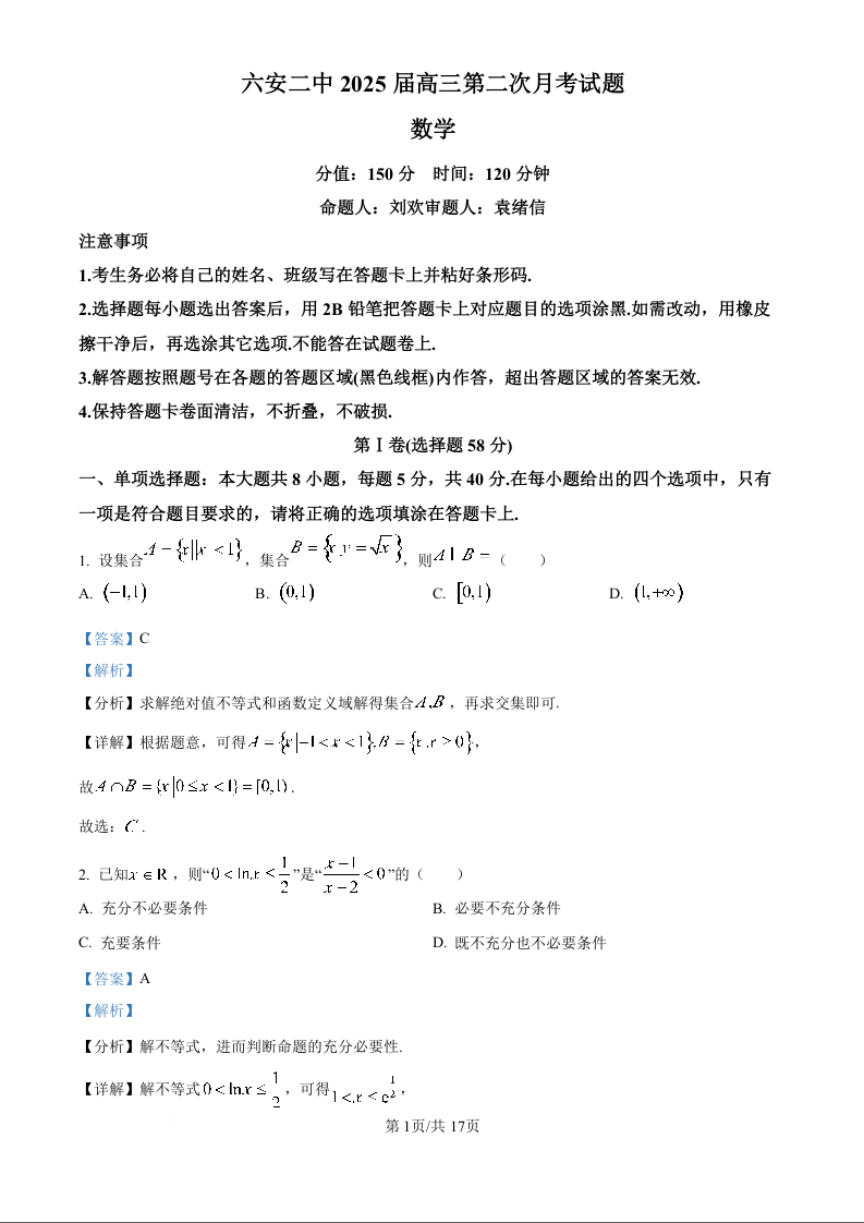 安徽省六安第二中学2025届高三上学期10月月考 数学答案