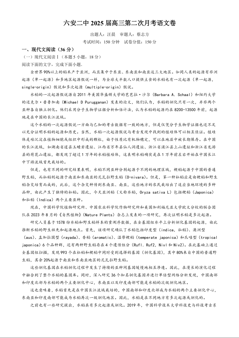 安徽省六安第二中学2025届高三上学期10月月考 语文