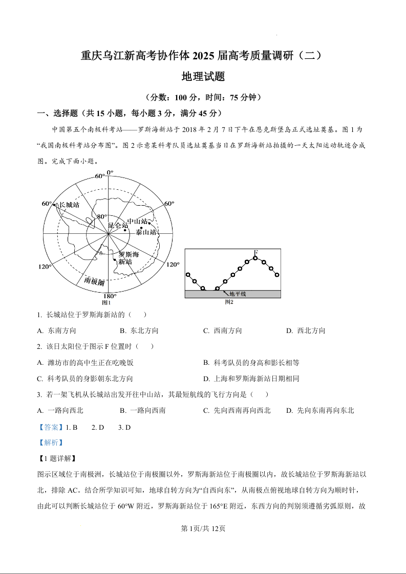 重庆市乌江新高考协作体2025届高考质量调研(二)地理答案