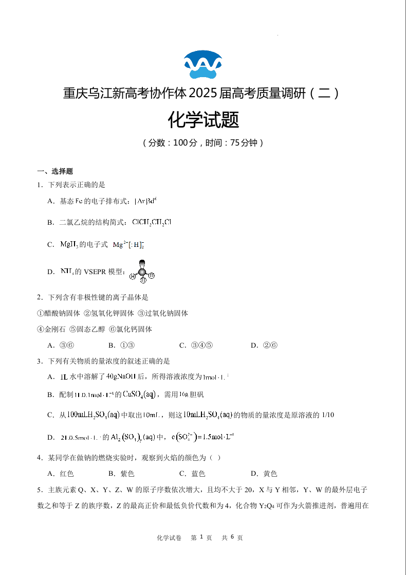 重庆市乌江新高考协作体2025届高考质量调研(二)化学