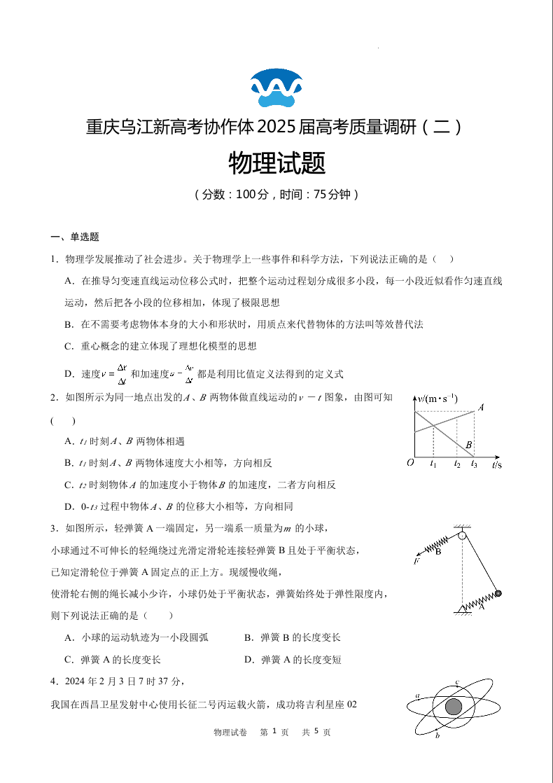 重庆市乌江新高考协作体2025届高考质量调研(二)物理