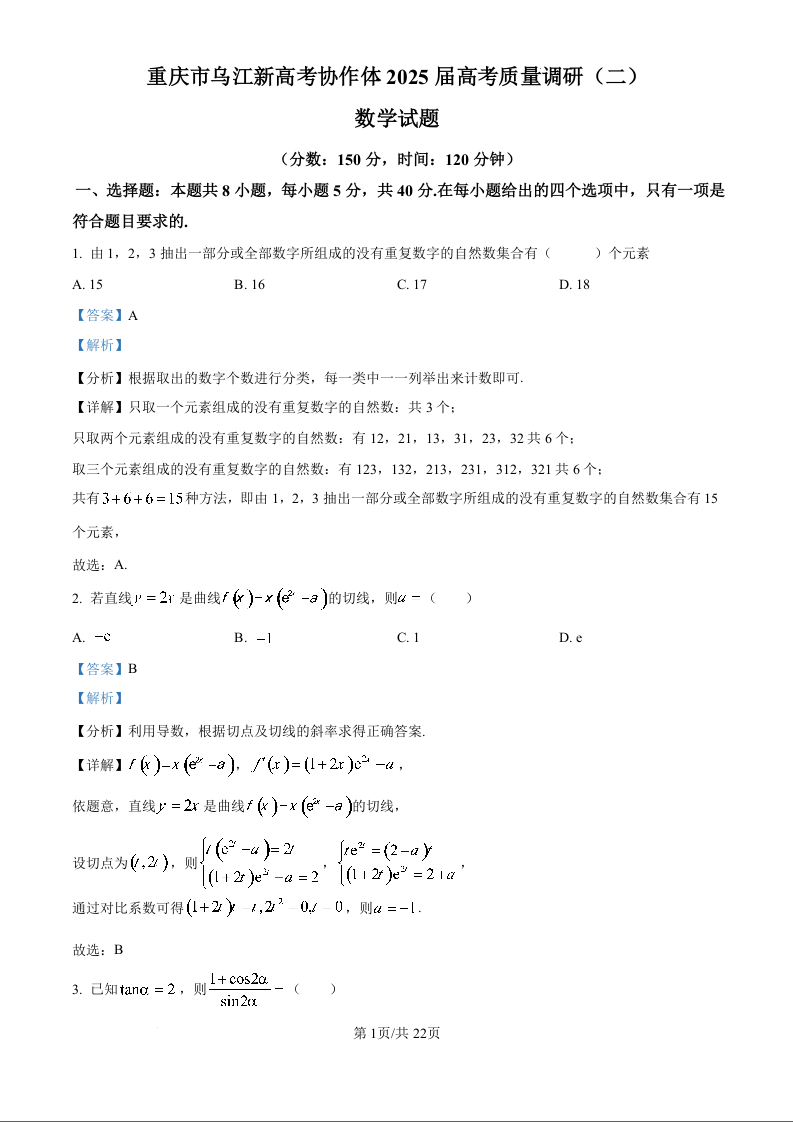 重庆市乌江新高考协作体2025届高考质量调研(二)数学答案