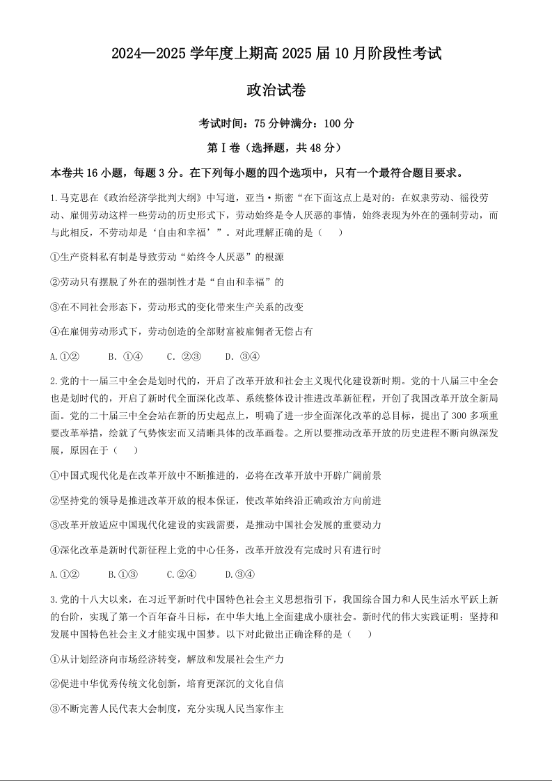 四川省成都市第七中学高2025届10月阶段性测试 政治