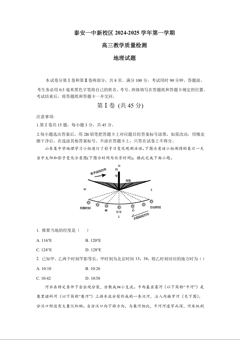 山东省泰安一中2025届第一学期10月教学质量测评 地理