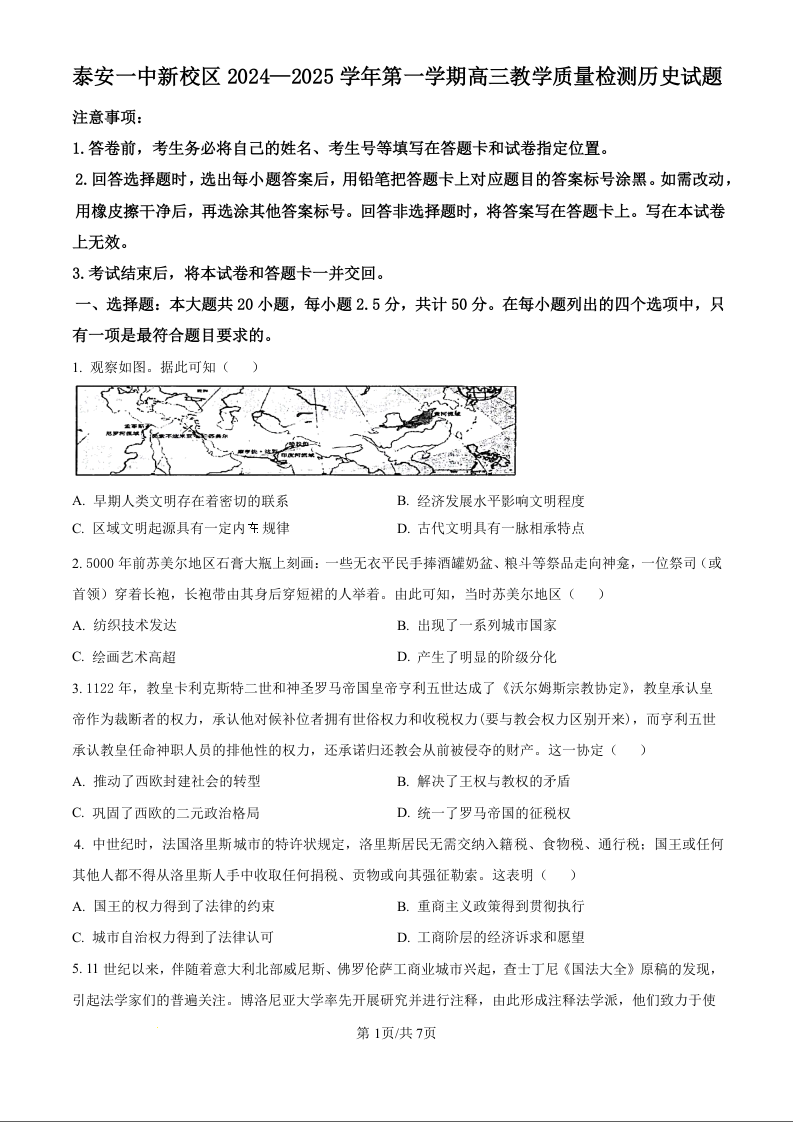 山东省泰安一中2025届第一学期10月教学质量测评 历史