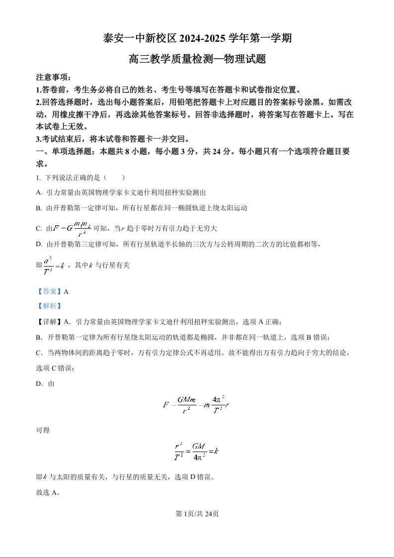 山东省泰安一中2025届第一学期10月教学质量测评 物理答案