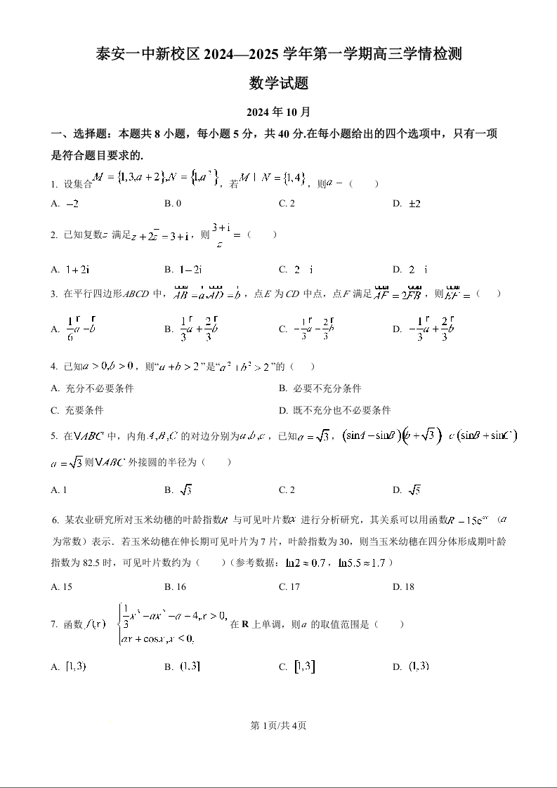 山东省泰安一中2025届第一学期10月教学质量测评 数学
