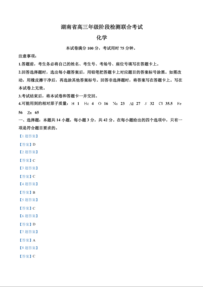 湖南省部分学校2024-2025学年高三年级10月阶段检测联合考试 化学答案
