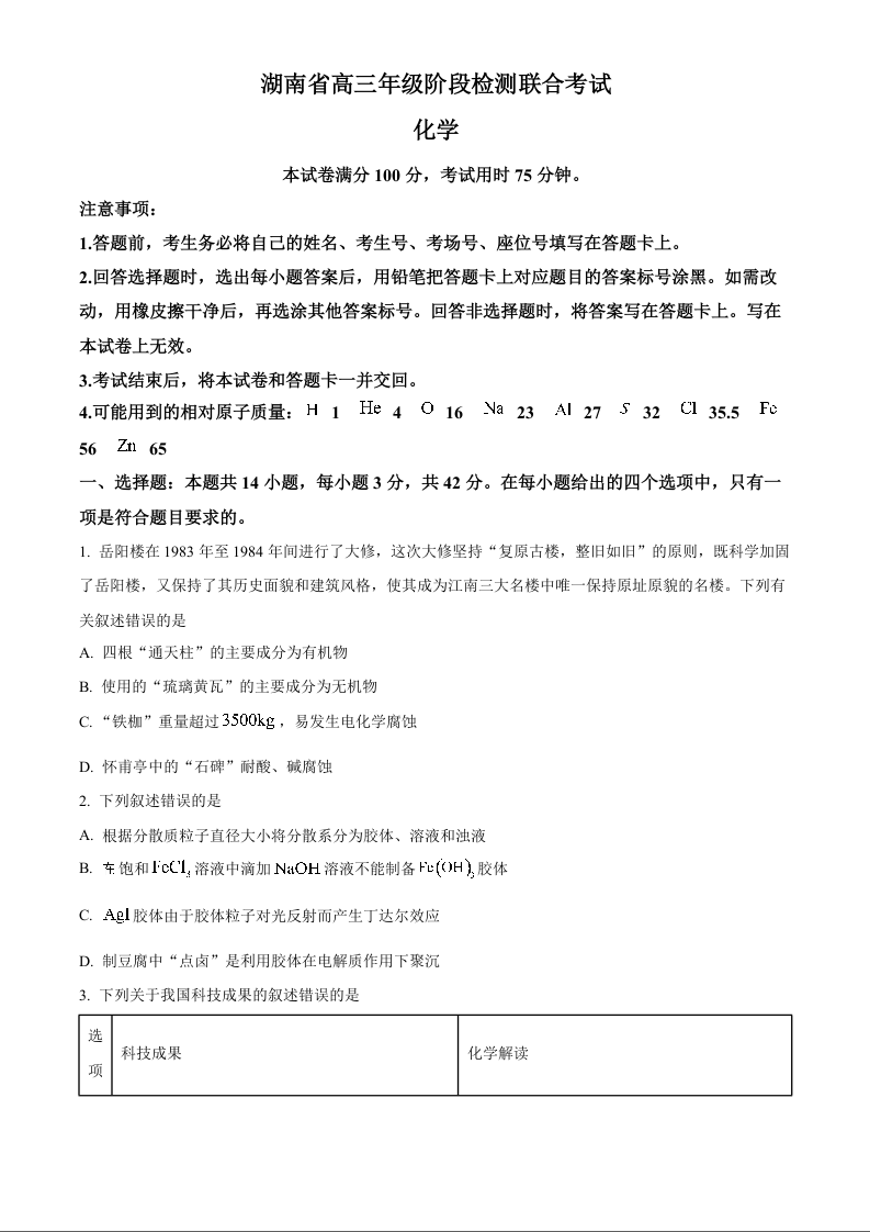 湖南省部分学校2024-2025学年高三年级10月阶段检测联合考试 化学
