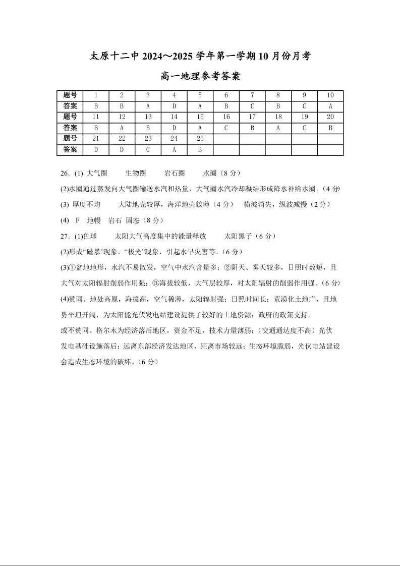 太原十二中2024-2025学年第一学期高一10月份月考 地理答案