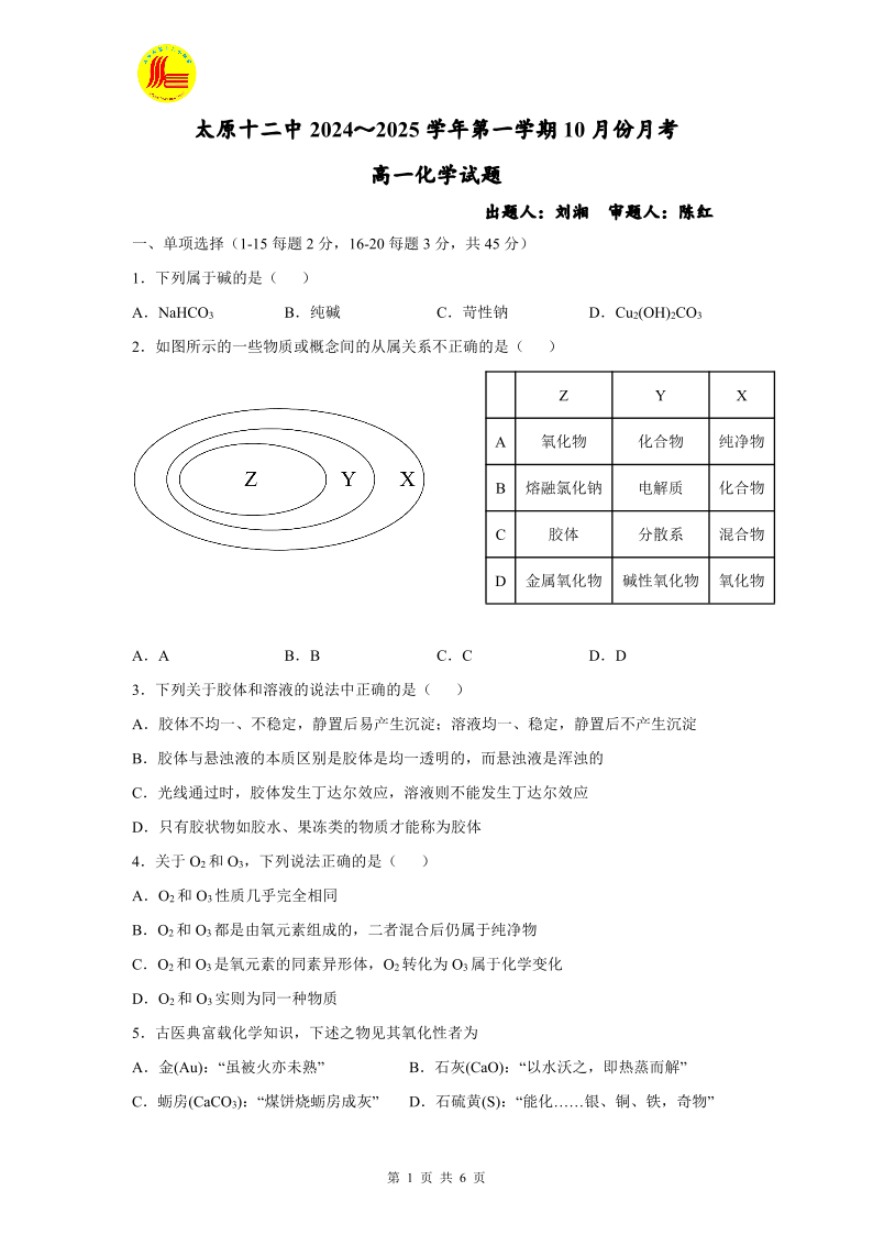 太原十二中2024-2025学年第一学期高一10月份月考 化学