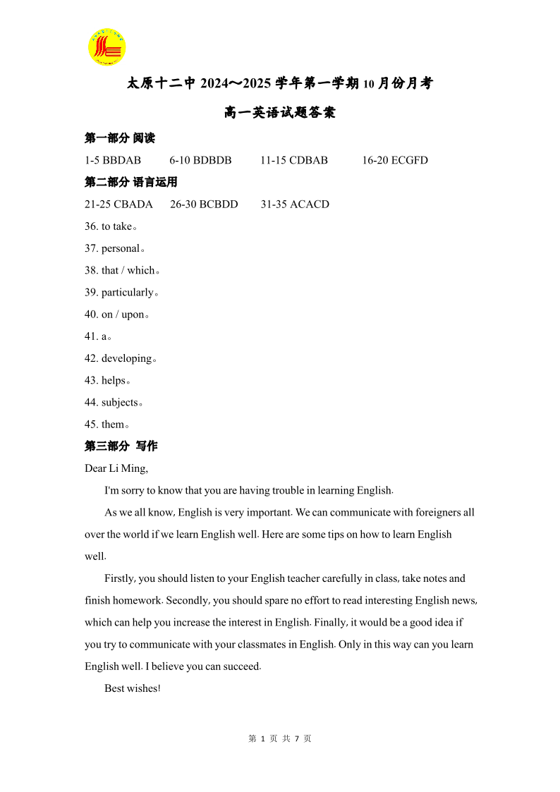 太原十二中2024-2025学年第一学期高一10月份月考 英语答案
