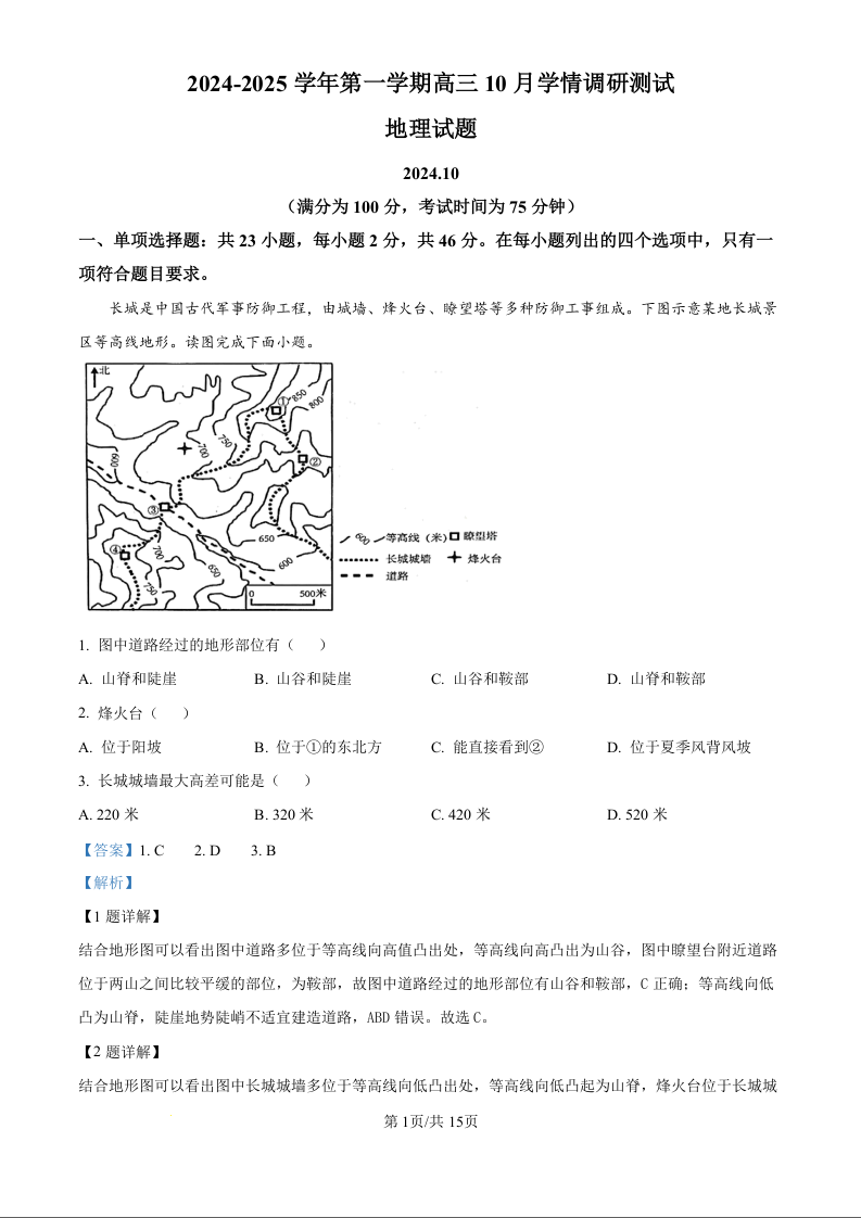 江苏省高邮市2025届高三上学期10月学情调研测试 地理答案