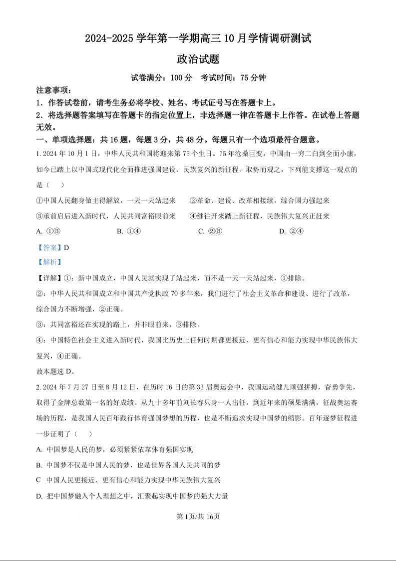 江苏省高邮市2025届高三上学期10月学情调研测试 政治答案