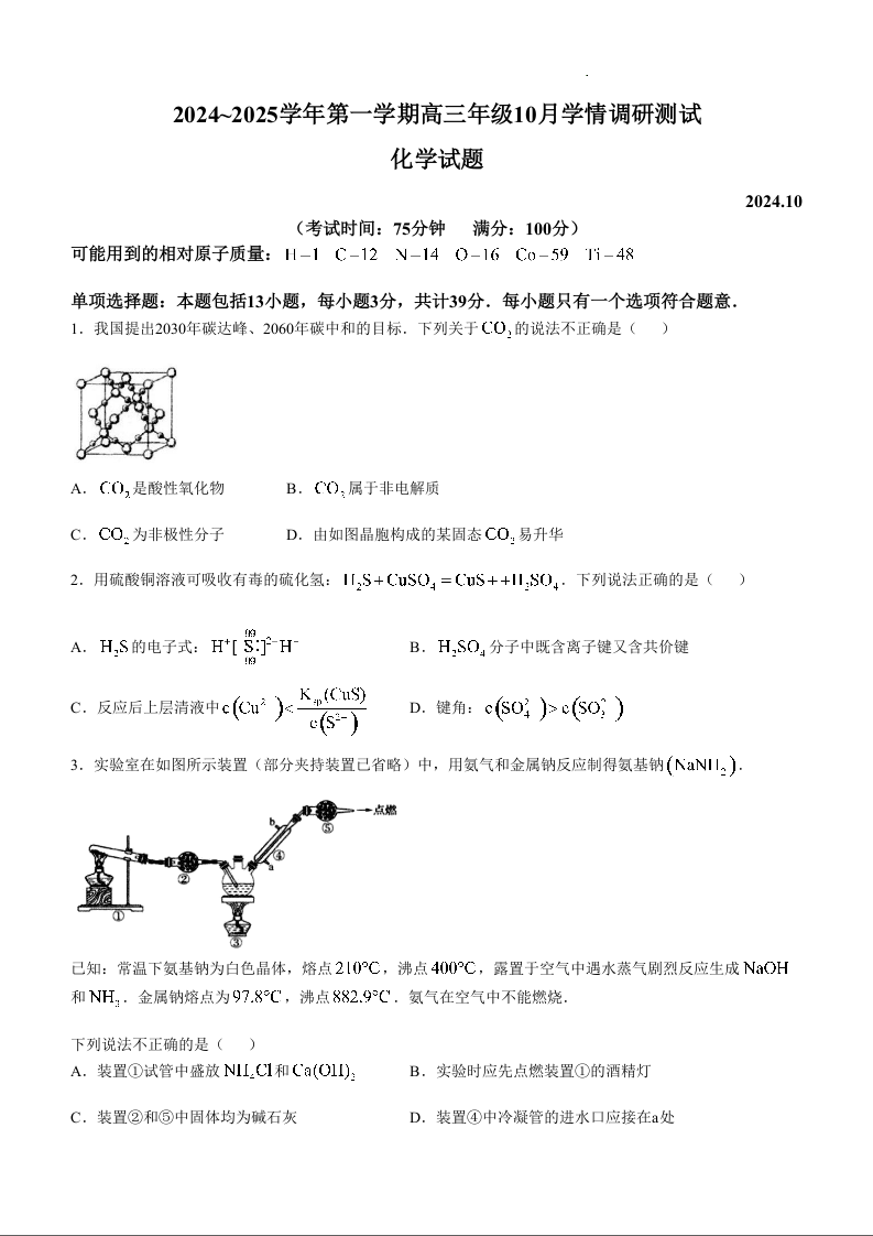 江苏省高邮市2025届高三上学期10月学情调研测试 化学
