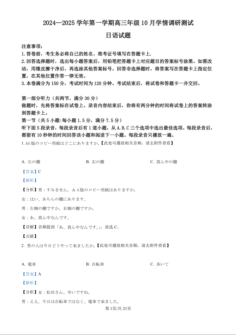 江苏省高邮市2025届高三上学期10月学情调研测试 日语答案