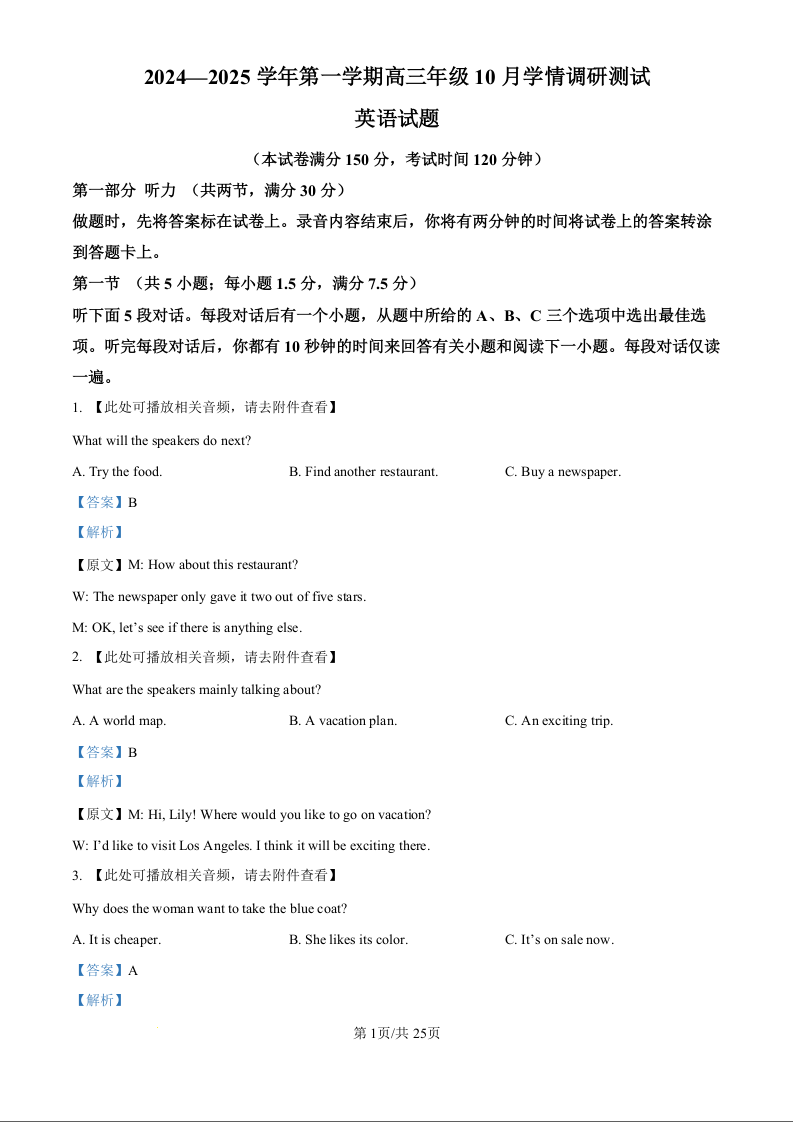 江苏省高邮市2025届高三上学期10月学情调研测试 英语答案