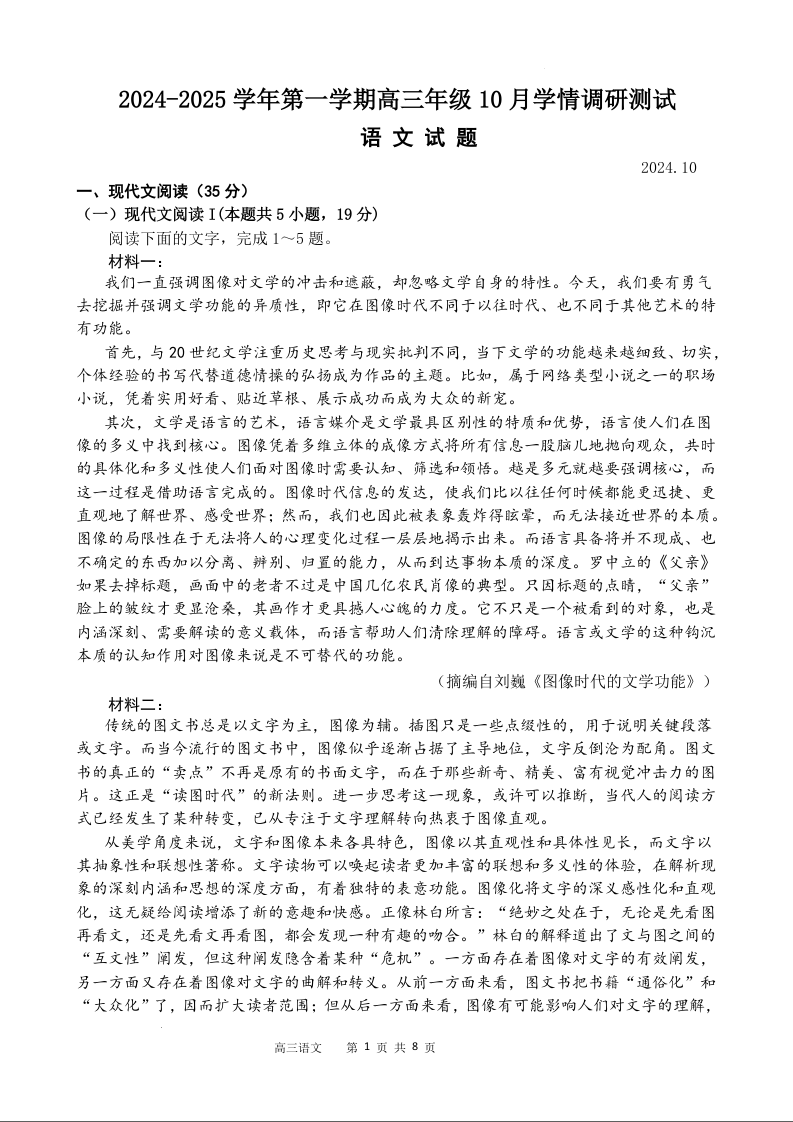 江苏省高邮市2025届高三上学期10月学情调研测试 语文