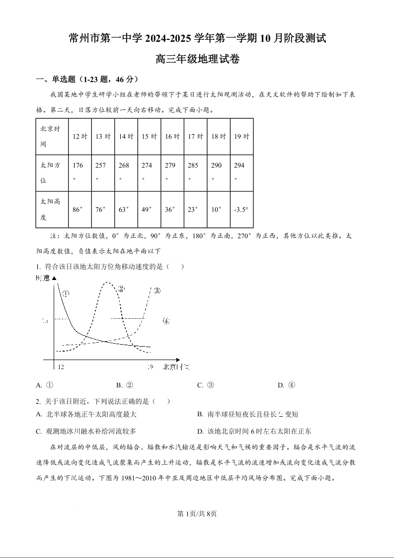 常州市第一中学2024-2025学年第一学期10月阶段测试 地理