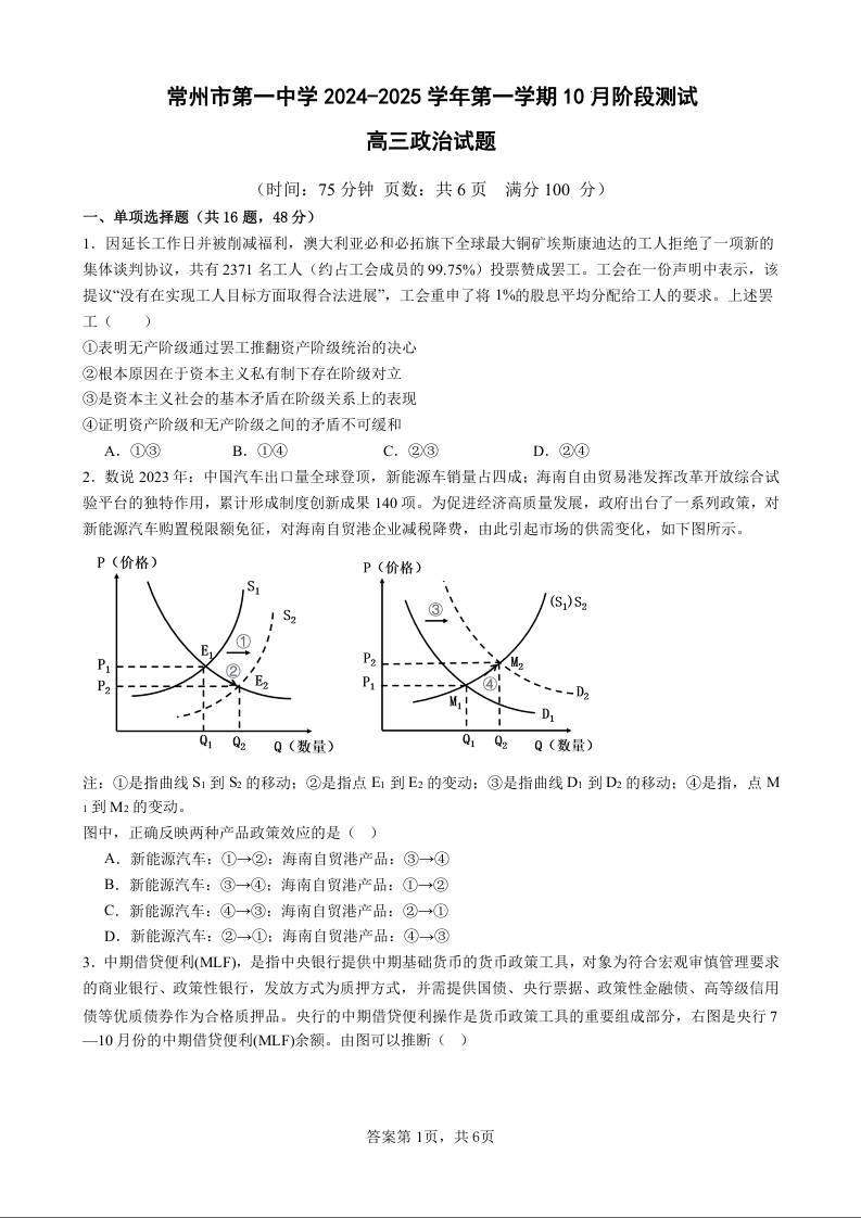 常州市第一中学2024-2025学年第一学期10月阶段测试 政治