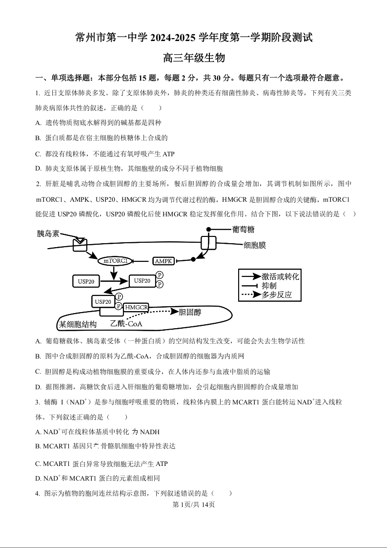 常州市第一中学2024-2025学年第一学期10月阶段测试 生物