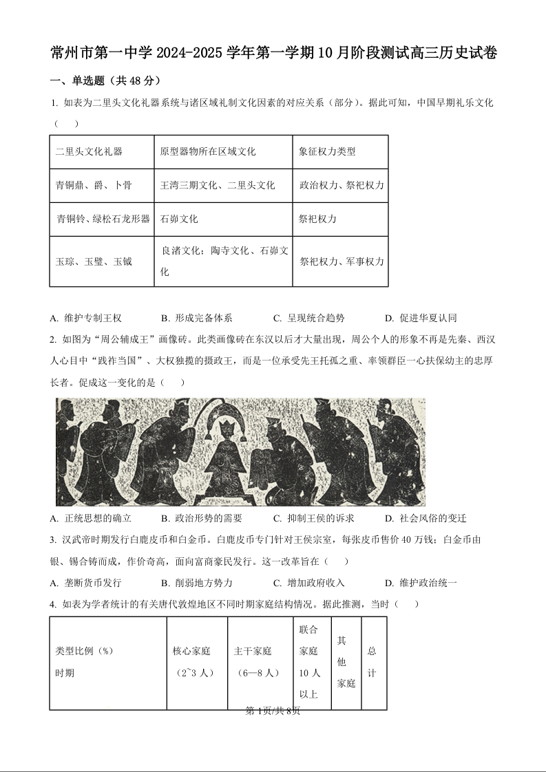 常州市第一中学2024-2025学年第一学期10月阶段测试 历史