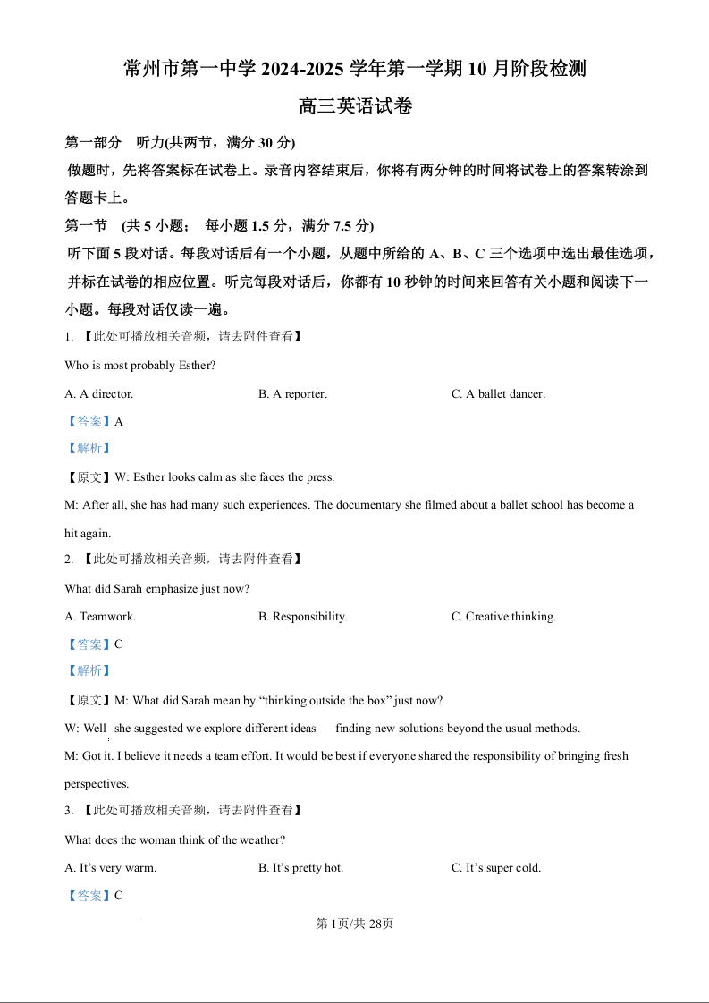 常州市第一中学2024-2025学年第一学期10月阶段测试 英语答案