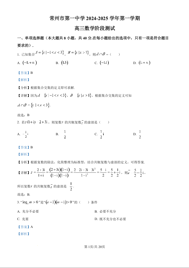 常州市第一中学2024-2025学年第一学期10月阶段测试 数学答案