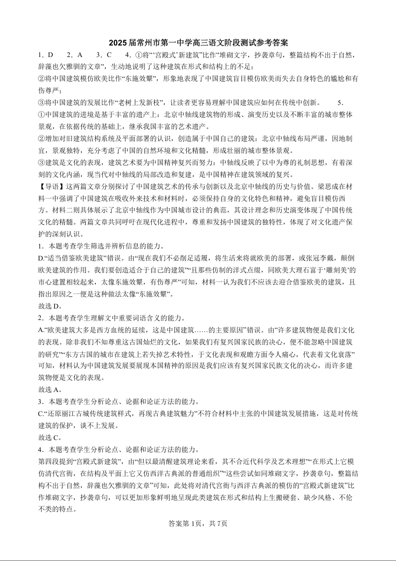 常州市第一中学2024-2025学年第一学期10月阶段测试 语文答案