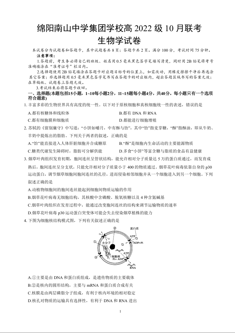 四川省绵阳南山中学集团学校高2022级高三10月联考 生物