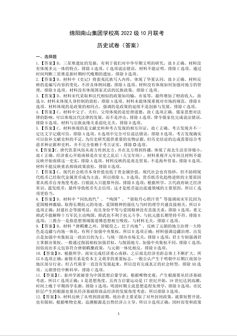四川省绵阳南山中学集团学校高2022级高三10月联考 历史答案