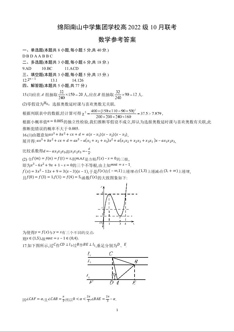 四川省绵阳南山中学集团学校高2022级高三10月联考 数学答案