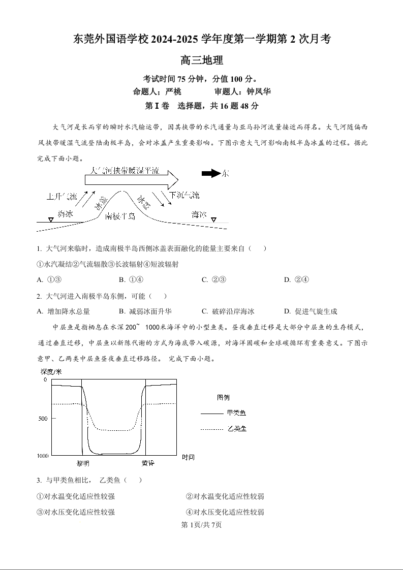 广东省东莞市东莞外国语学校2025届高三上学期10月月考 地理